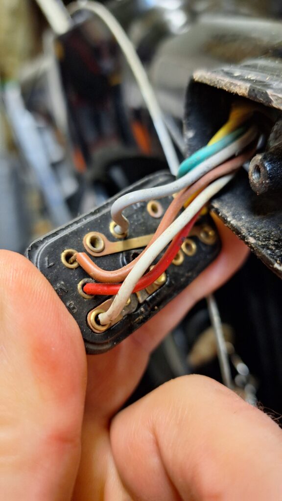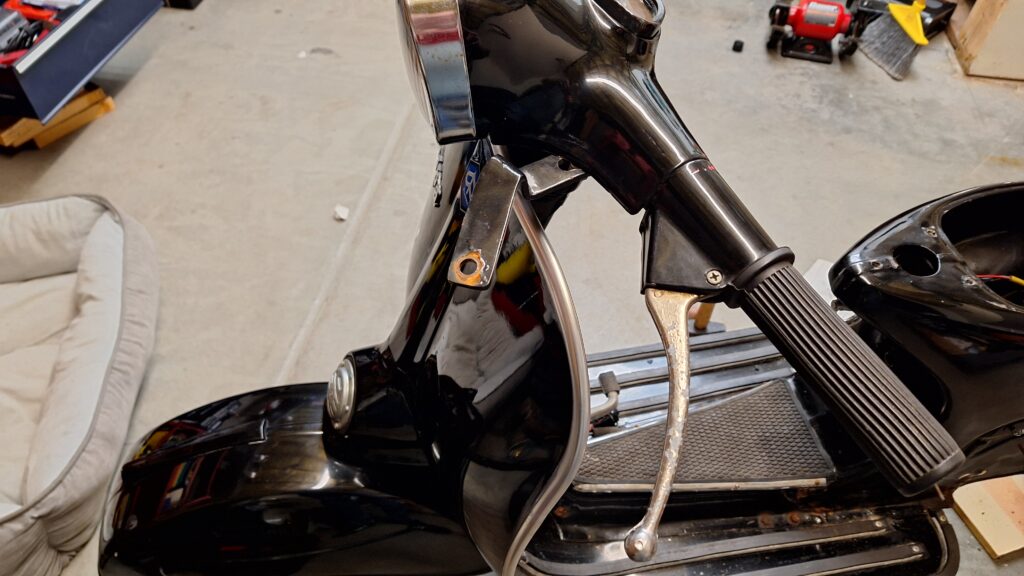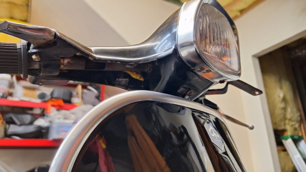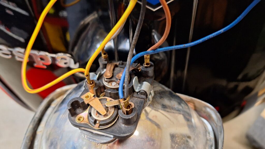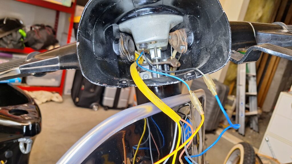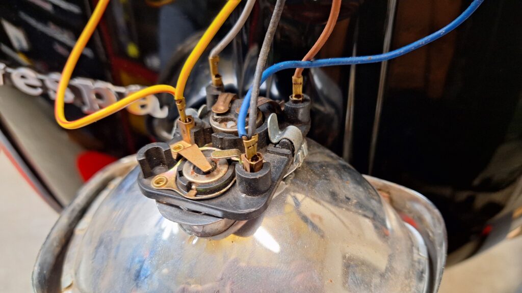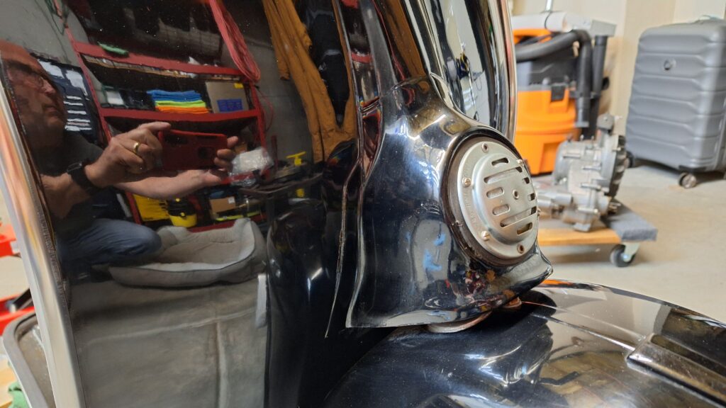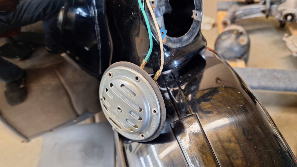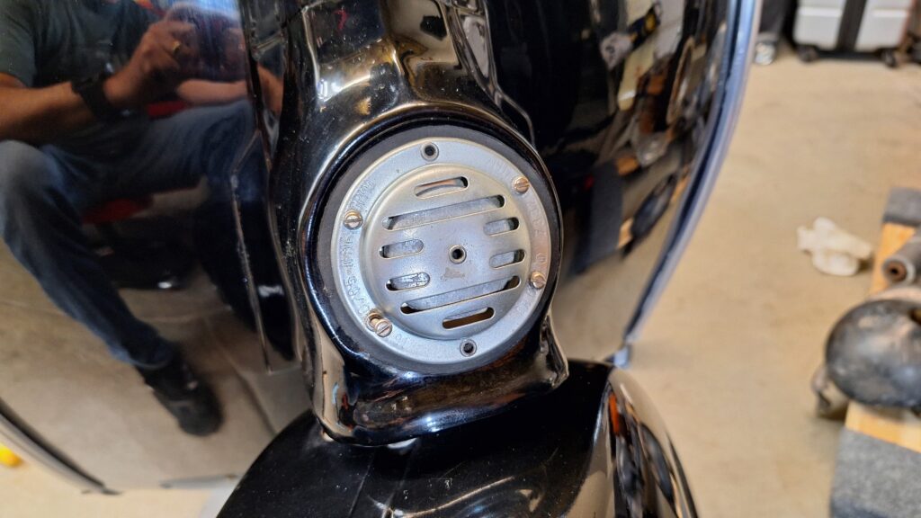Not much to show with the horn. Four screws and two spade connectors and it is free. The horn only works with the engine running, as there is no battery. Once the engine is running again, I will test it to make sure it functions. I do plan to replace it with a Vespa OEM product that is chrome finished. I just need to test it to determine whether it is AC or DC coming through those wires.