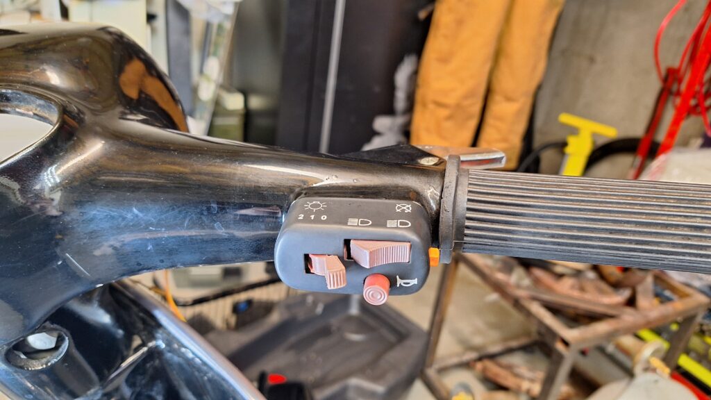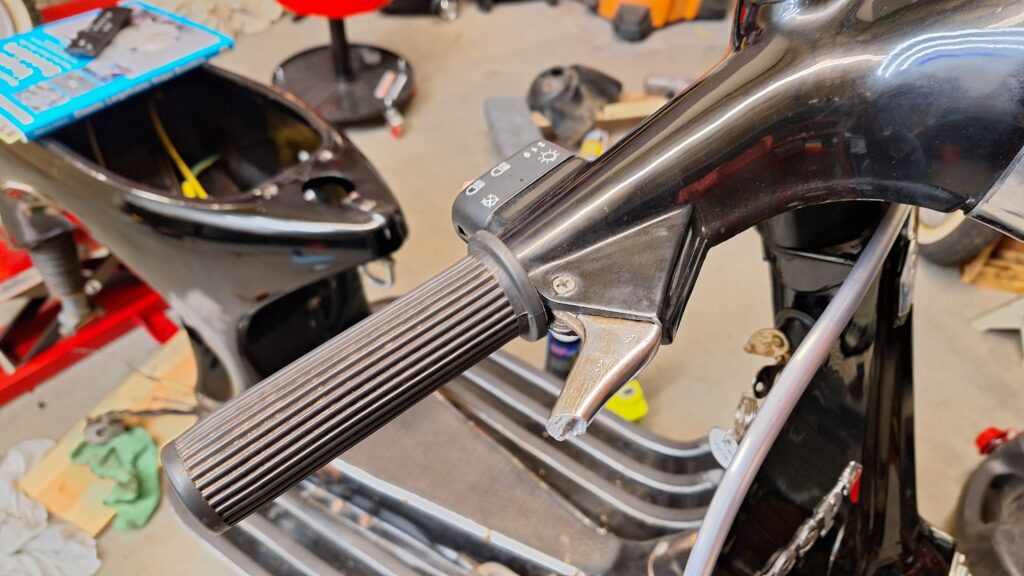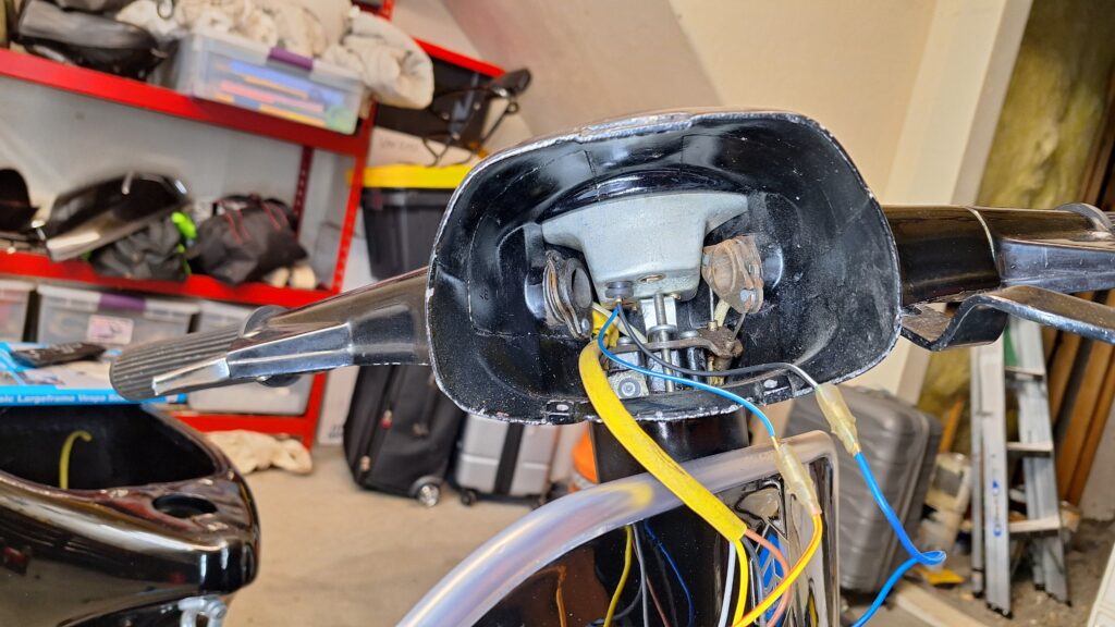 You can also see the back/bottom of the speedometer. One long screw will loosen the speedo from the handlebar housing. From there, the speedometer cable (silver, knurled nut at the bottom) can be unscrewed and the speedo is free. As a side note, I have another Piaggio scooter that is a Euro model and has the speed marked in kilometers per hour and not miles per hour. To avoid having to do mental math to ensure I am not speeding, I wanted to replace the speedo with a “MPH” version and was able to find a replacement (MPH) that is shipping from overseas and should be here in about a month. I’ll be sure to share photos of it during reassembly.