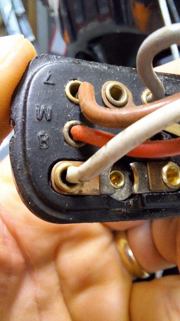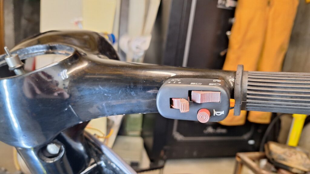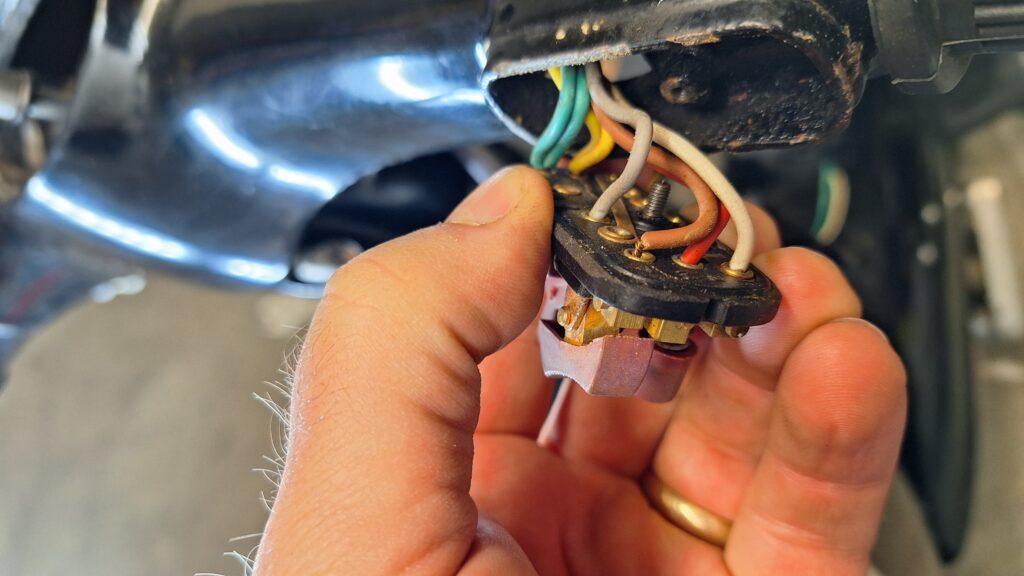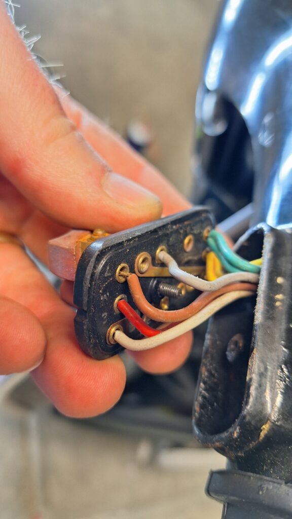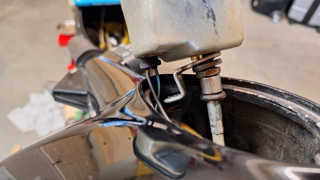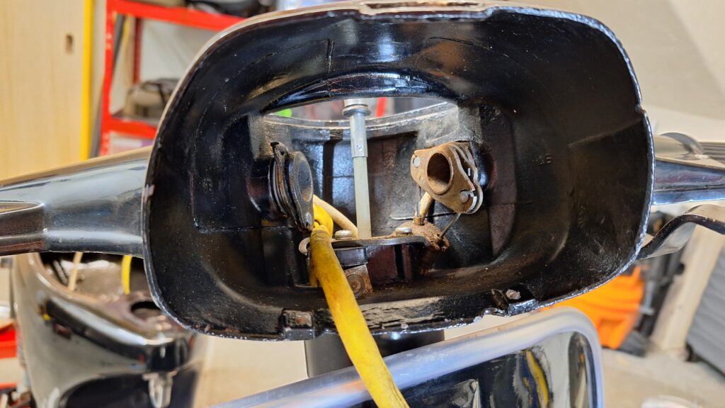 One other thing to note in the picture “looking in” with the headlight removed – you can see the ends of the throttle tube and shifter tube. There are 2 cables on the right – throttle and front brake and 3 cables on the left – upshift, downshift, and the clutch. I plan to replace all of the cables with modern, Teflon-lined cables to give Christy a fresh start with strong and smooth cable controls. More on these later.