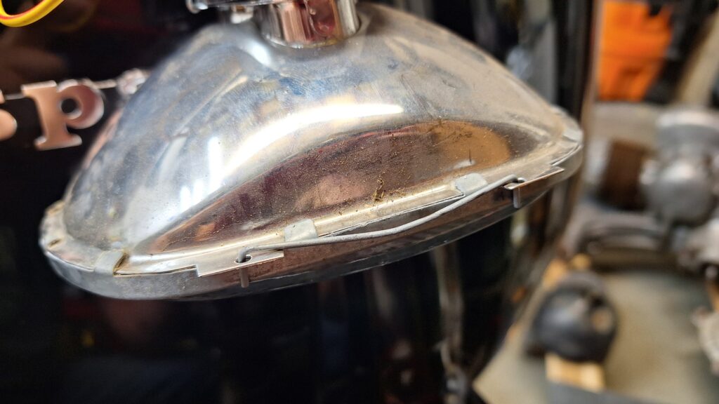 The headlamp is removed with two small screws that secure the chrome trim to the bulb housing. To access the screws, you have to swing the handlebars full left and then full right to be able to loosen using a small screwdriver. From there, the bottom of the trim tilts out and then removed by lifting a tab out of a slot in the handlebar frame. You might be able to see it in one of the photos below.