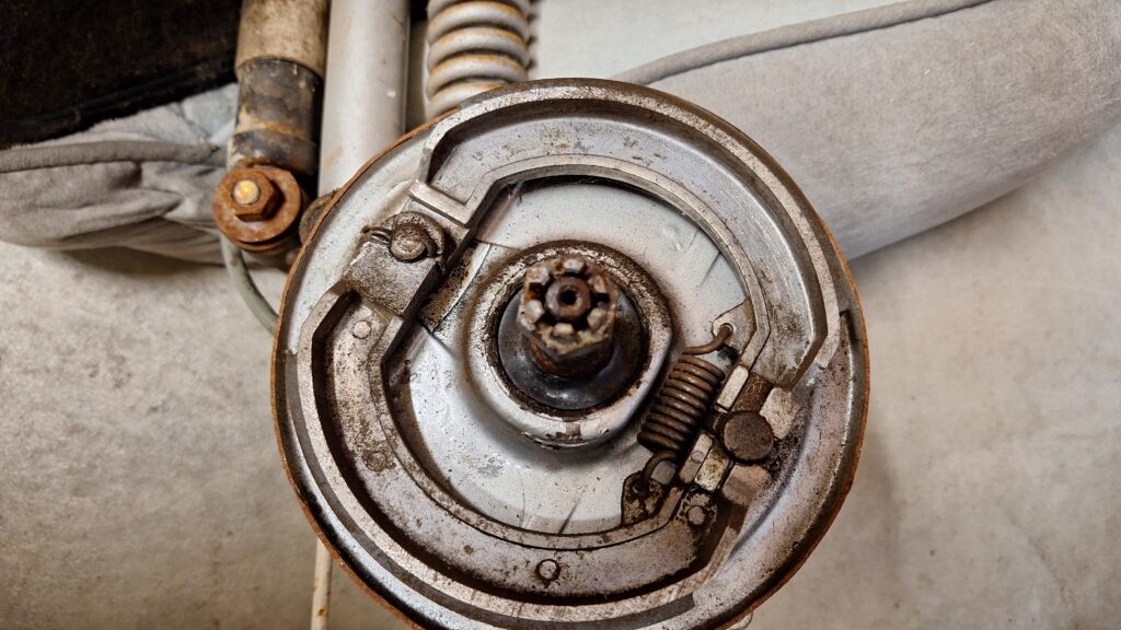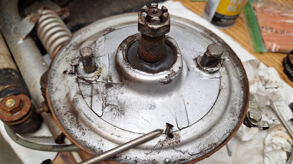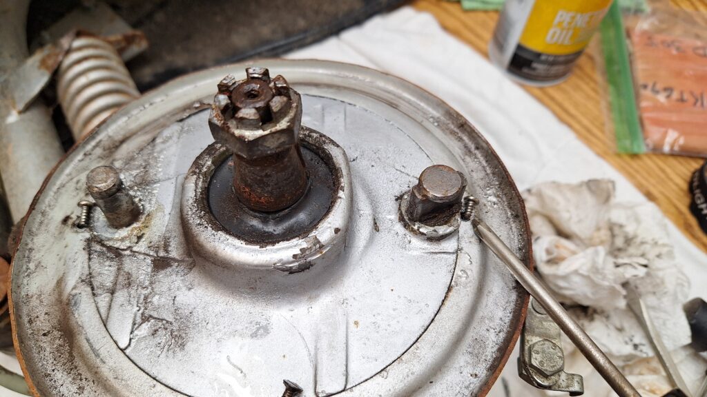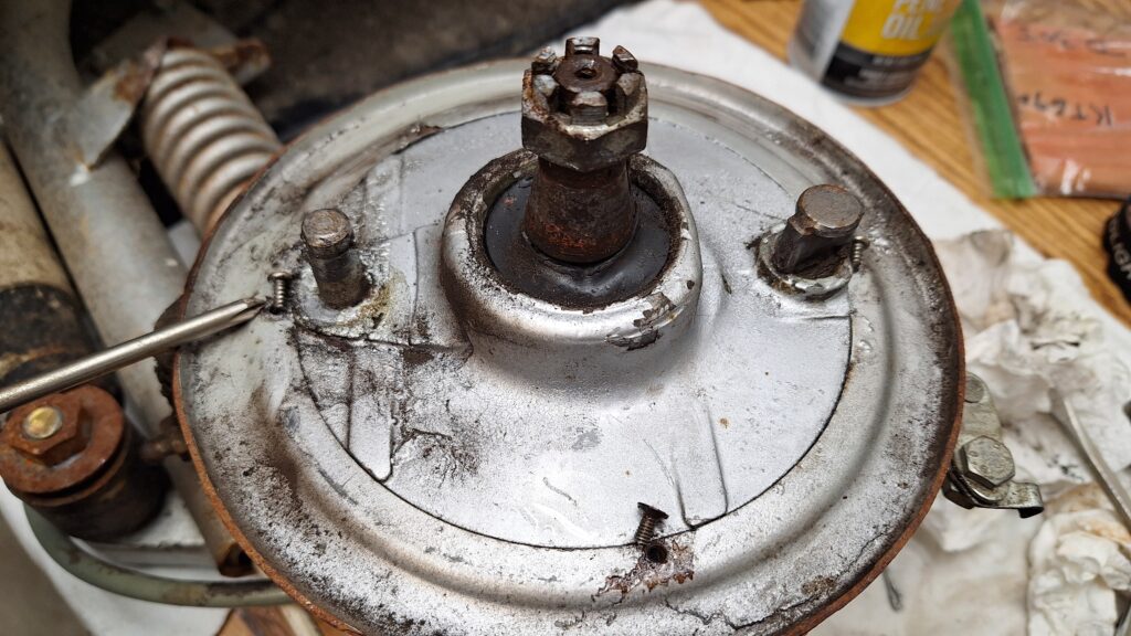 I wasn’t quite sure where to start here, so I squirted some penetrating oil on the rusty bits and examined the hub to see where to start. The brake pads were an easy target, so I pulled them off and then removed the dust shield – 3 tiny (and mismatched) screws.