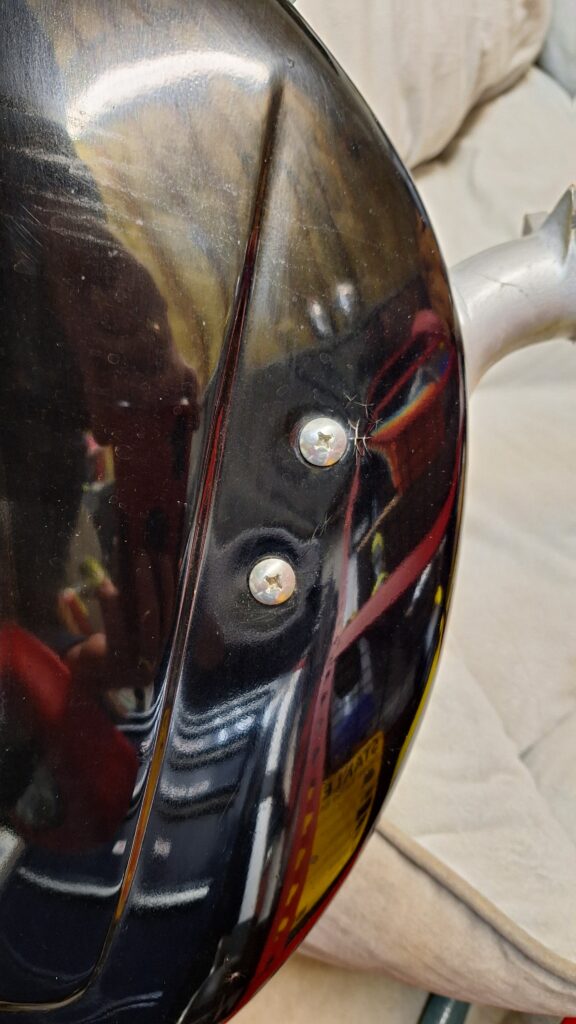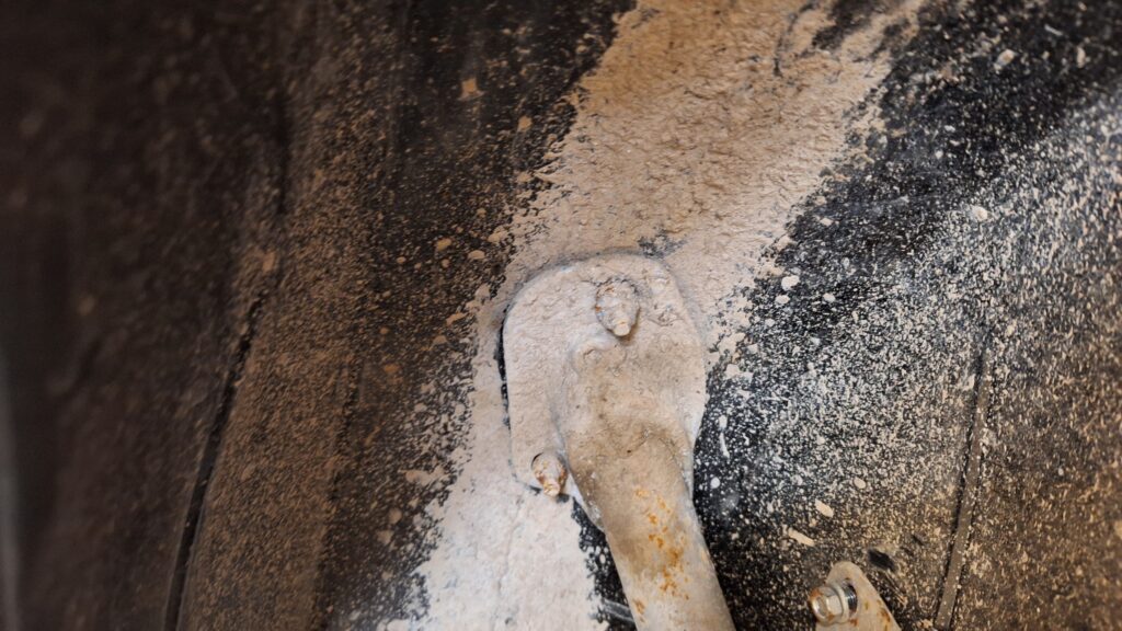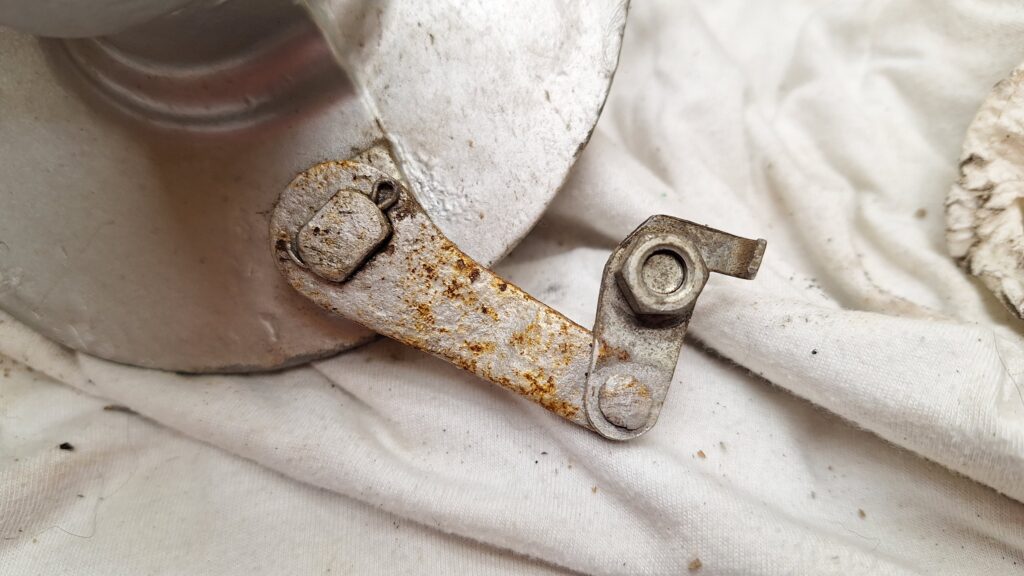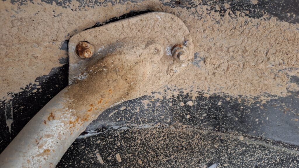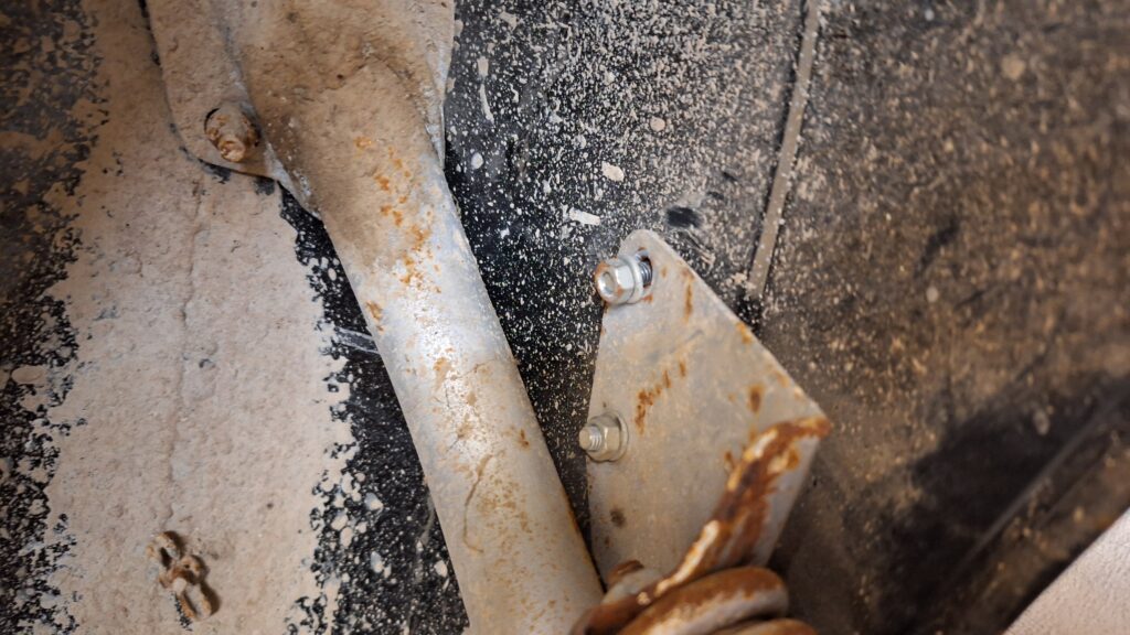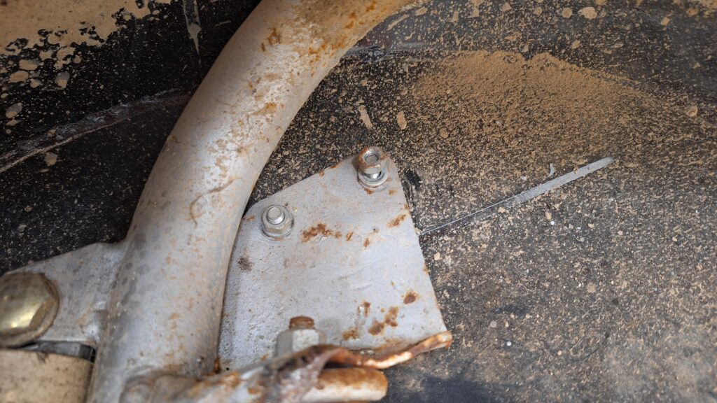 I took a few photos of the screws, nuts and bolts holding the mud guard to the steering arm for reassembly purposes. You can see a bit of white/chalky paint on the mud guard that is the result of it rubbing on a blown out rusty patch on the frame.