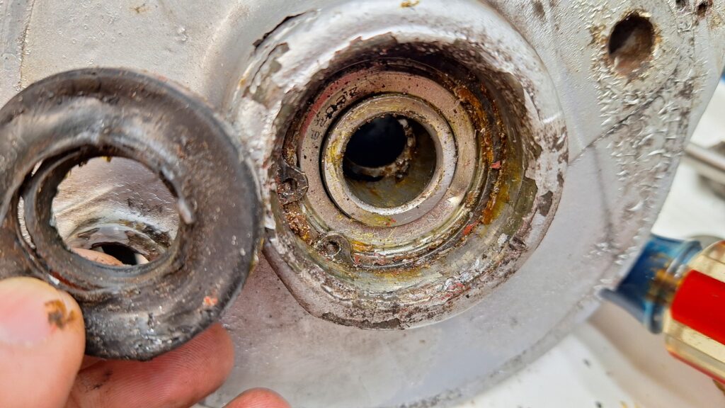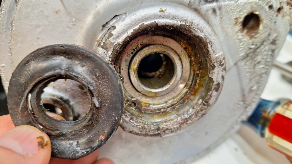 I drifted the axle out with a punch and hammer. You can see the axle with the castle nut in the set of photos below – I just forgot to photograph the removal process. Important note: the speedometer drive must be removed before attempting to remove the axle. The oil seal was severely deformed but popped out easily with a flat screwdriver.
