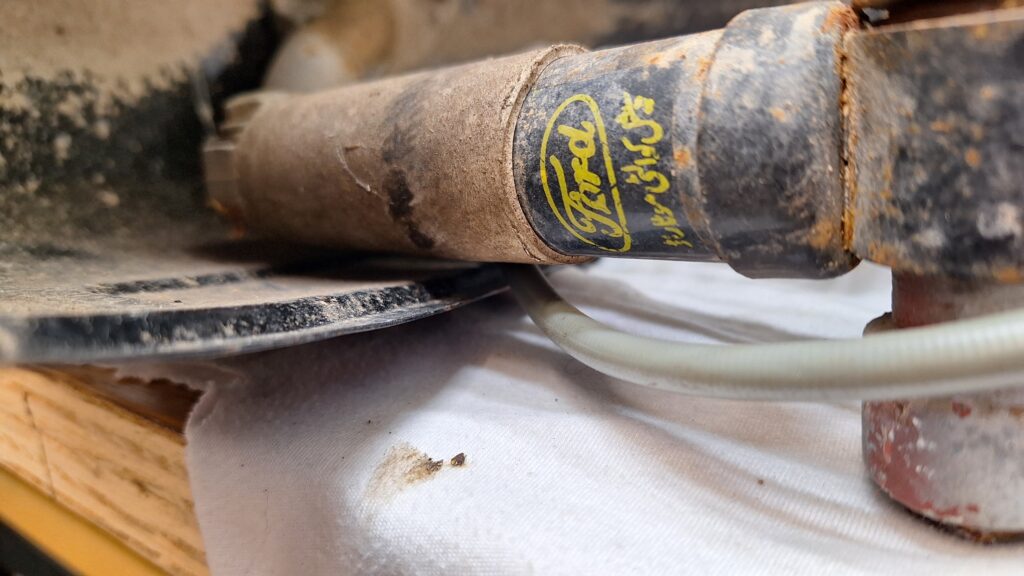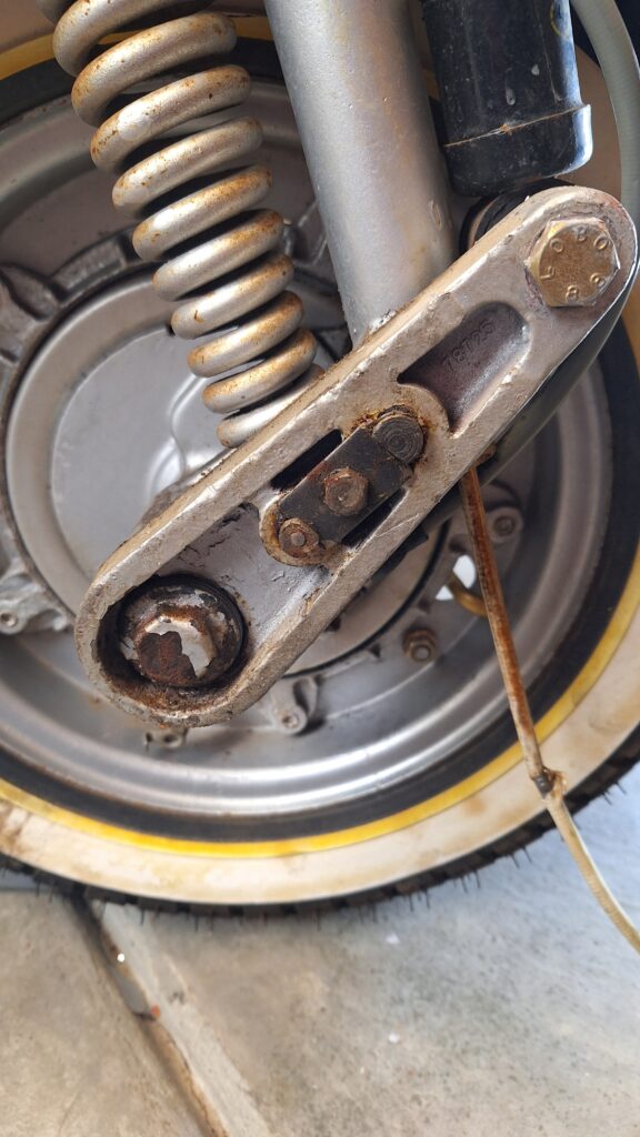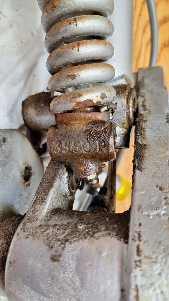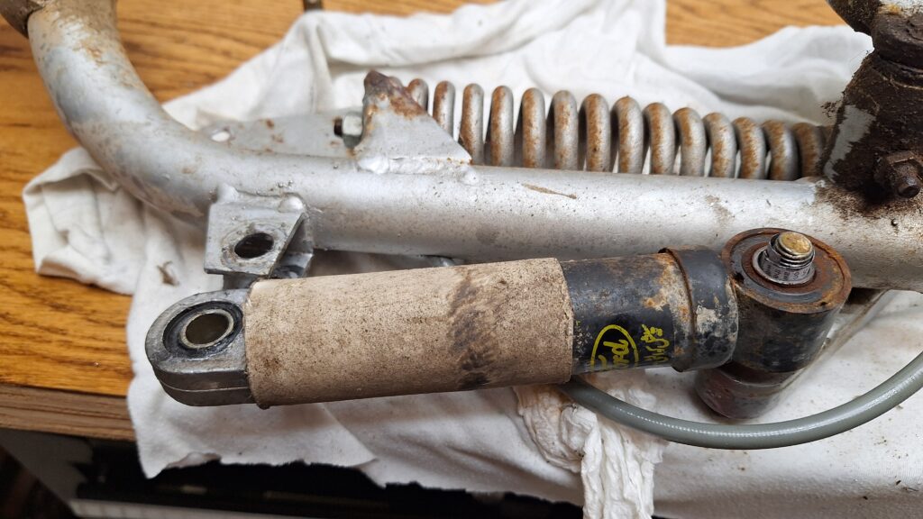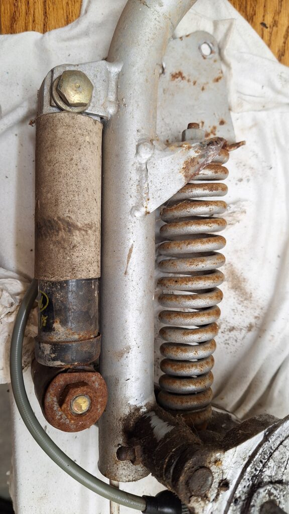 With the penetrating oil having some time to work, I was ready to break down and remove the actual suspension components. The shock absorber was easily accessible and only had 2 bolts securing it. I loosened those with a 17mm socket and wrench and levered it free. Who knew Ford made shocks for Vespa – LOL!!
