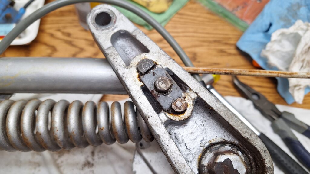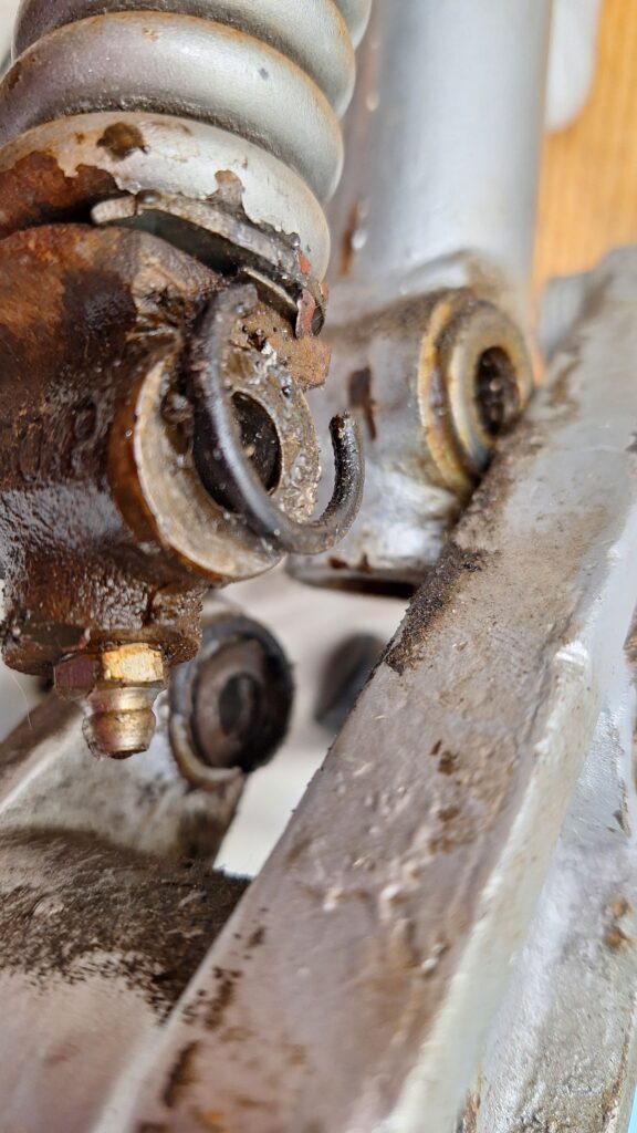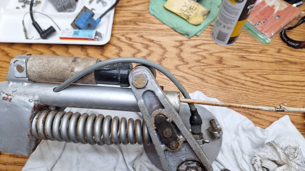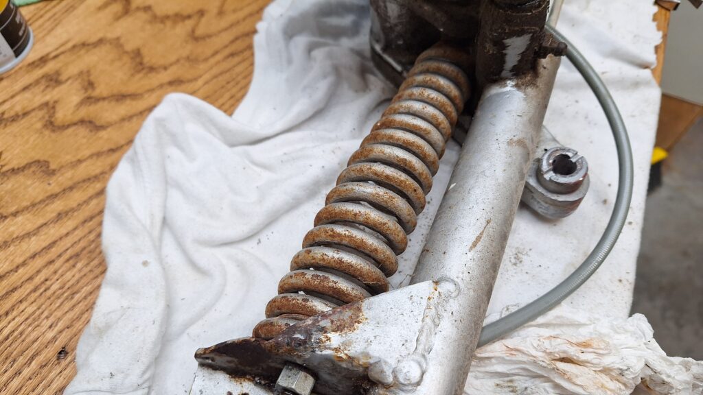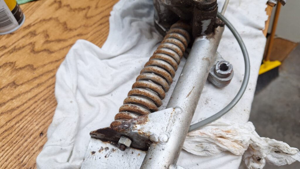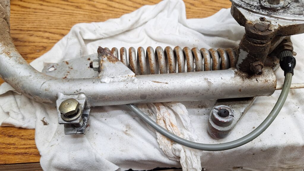 Next was the spring. Two pivot pins that allow the shock and spring to actuate are secured with a fork link spring plate with a single 10mm bolt. With that removed, I used a punch to gently free the pins from decades of dirt and congealed grease that acted like modern day Loctite. With the bottom half of the spring loose, a single nut secured the top of the spring to the steering arm.