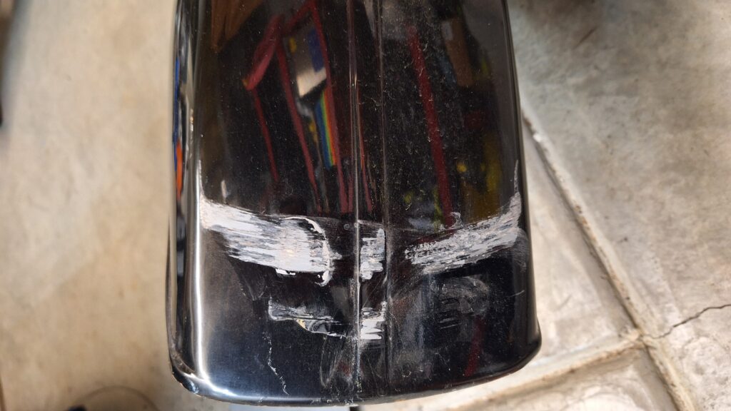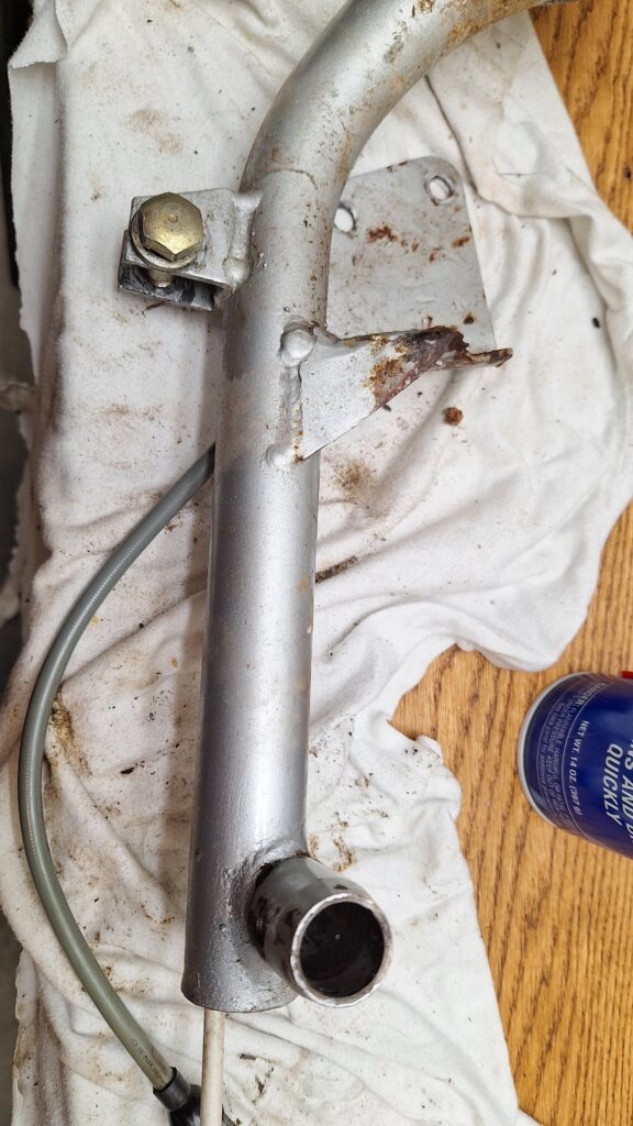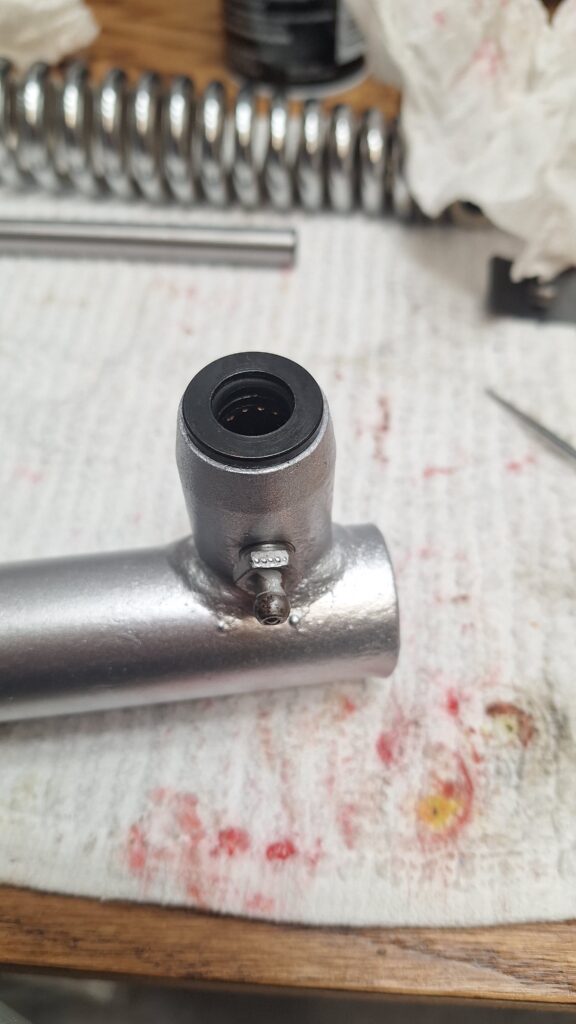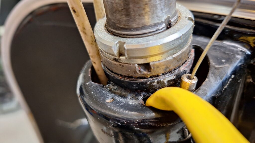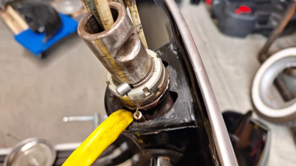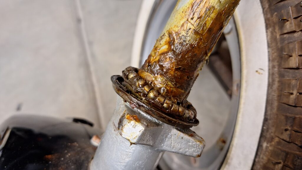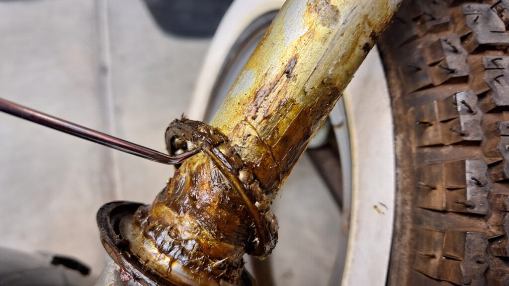 Here are a few images of the crusty, dry grease on the lower bearings. The lower bearing seat has to be drifted free of the downtube to allow the front mud guard to be removed. It is a friction or “interference” fit, so gentle tapping under the race with a drift will easily loosen it.