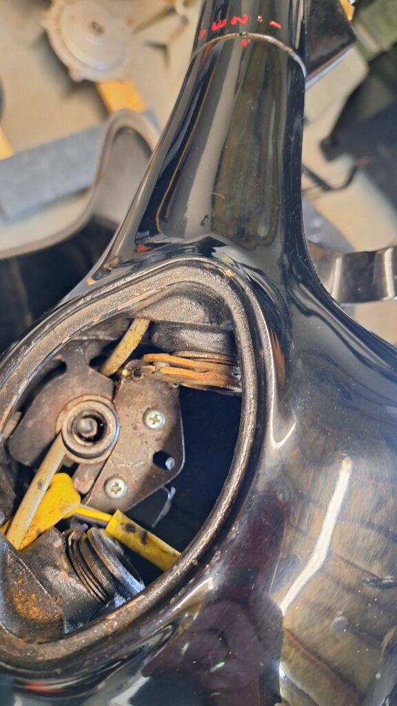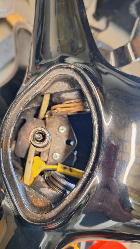 Once the castle nuts are removed, gravity will pull the steering arm down through the center of the bearing races and off the body. Note for those of you doing this at home…don’t forget about Newton’s third law. For every action there is an equal and opposite reaction. The sudden lack of weight on the front of the scooter due to the removal of the steering arm, hub, brakes, etc. causes the frame to flip back on its butt. Be ready!! (I was not.)