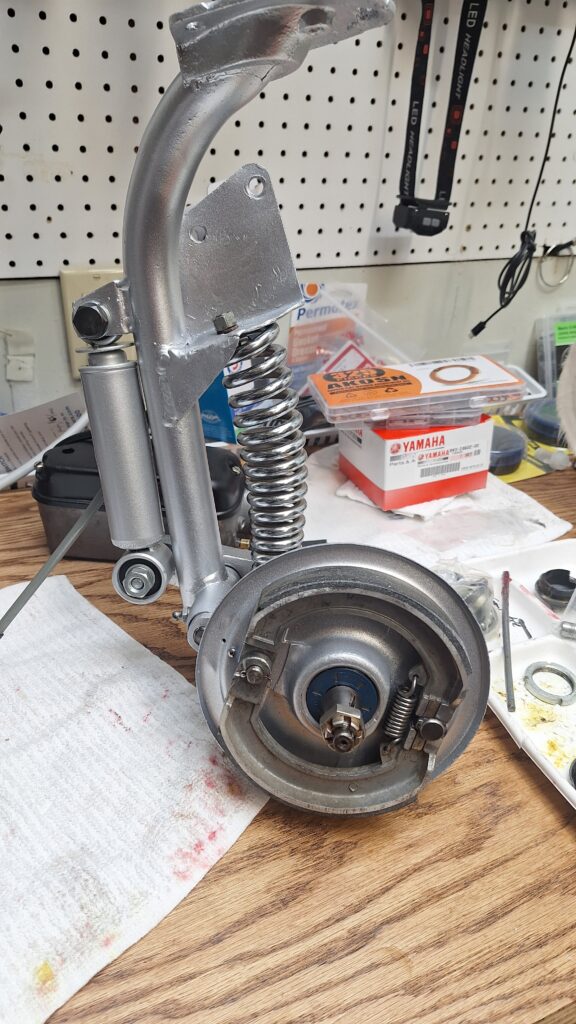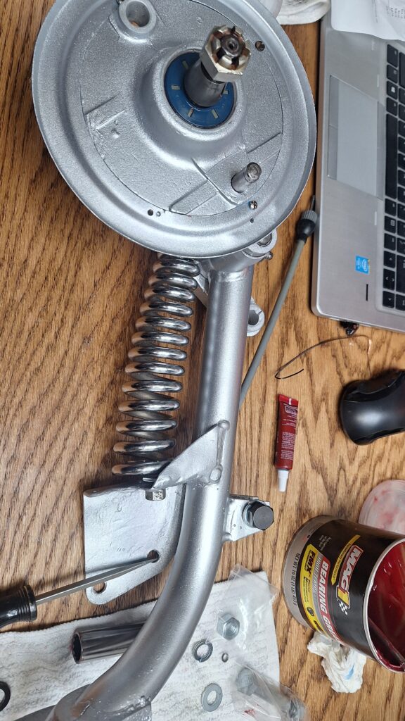 Here are a few photos of the front hub at various stages of the rebuild process. It was all pretty easy to put back together…except for the spring and shock. That took some creative leveraging to get it bolted back together.