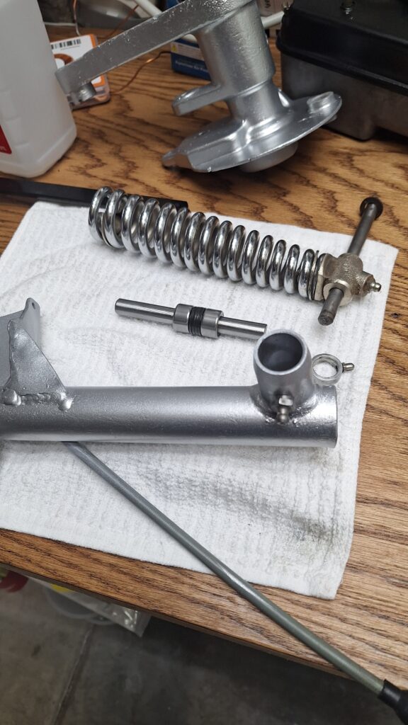 It has taken some time to get started again, but I am ready. I did buy a bunch of new components for the front suspension – bearings, seals, a shock, a chrome spring, as well as assorted nuts, bolts and washers, so I figure this is as good a place to start as any,