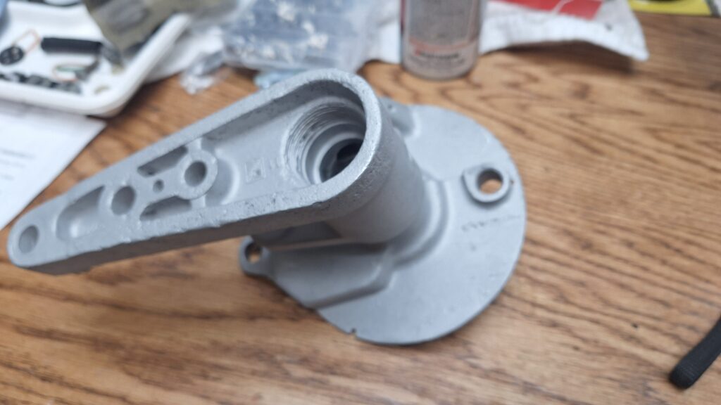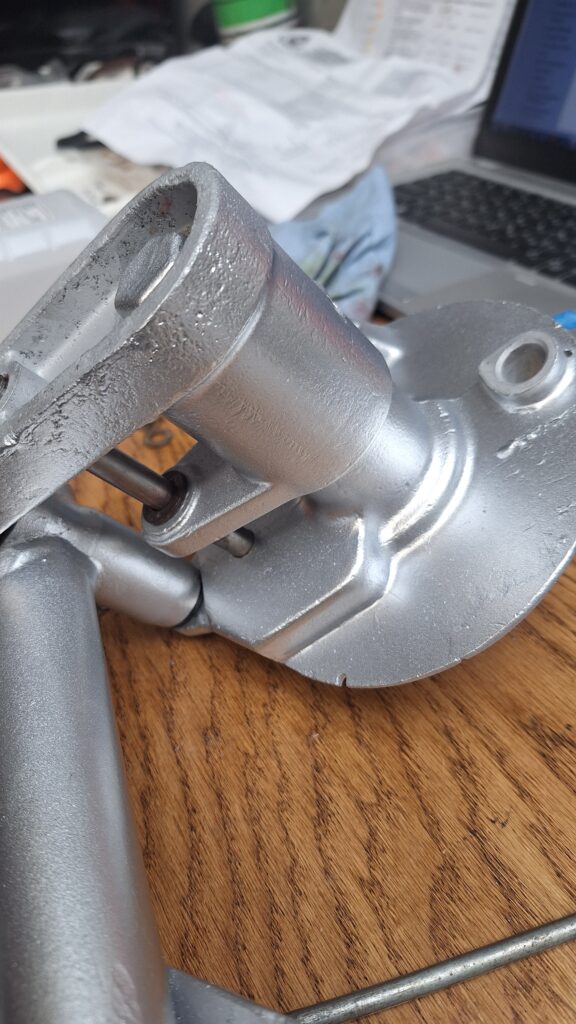 Here is the front hub after media blasting to remove the old finish but before it has fresh paint.